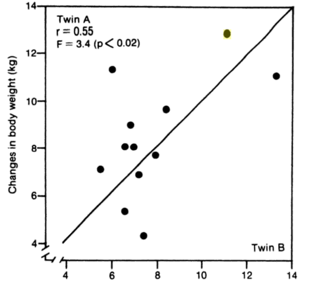 Dit is per persoon verschillend, omdat een beweegpatroon, eetpatroon en hormonen hierbij een rol spelen. Kijk maar naar het volgende grafiek waar ze 24 mensen voor 22 dagen 1000 kcal meer lieten eten dan dat ze nodig hadden (positieve energiebalans) [64]: